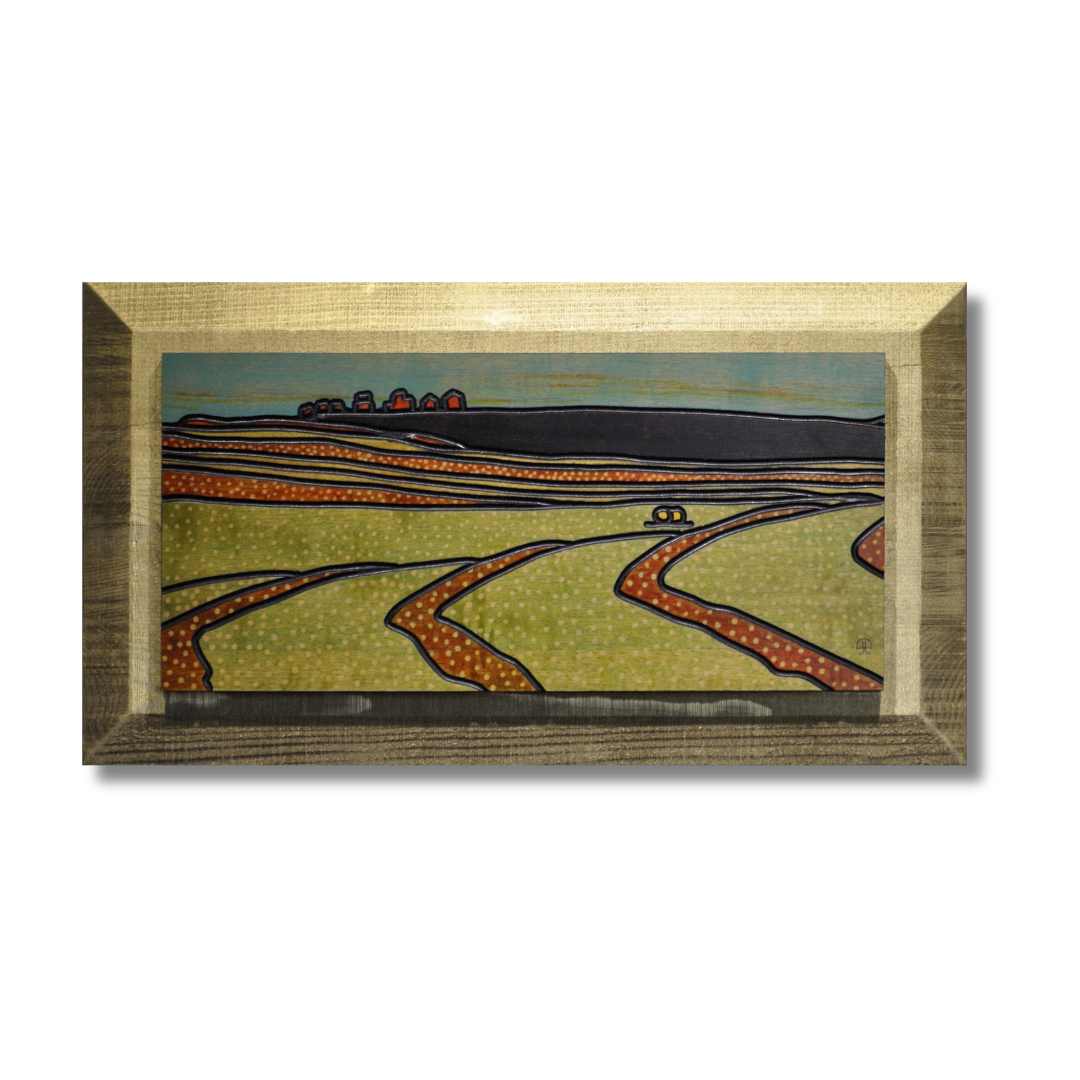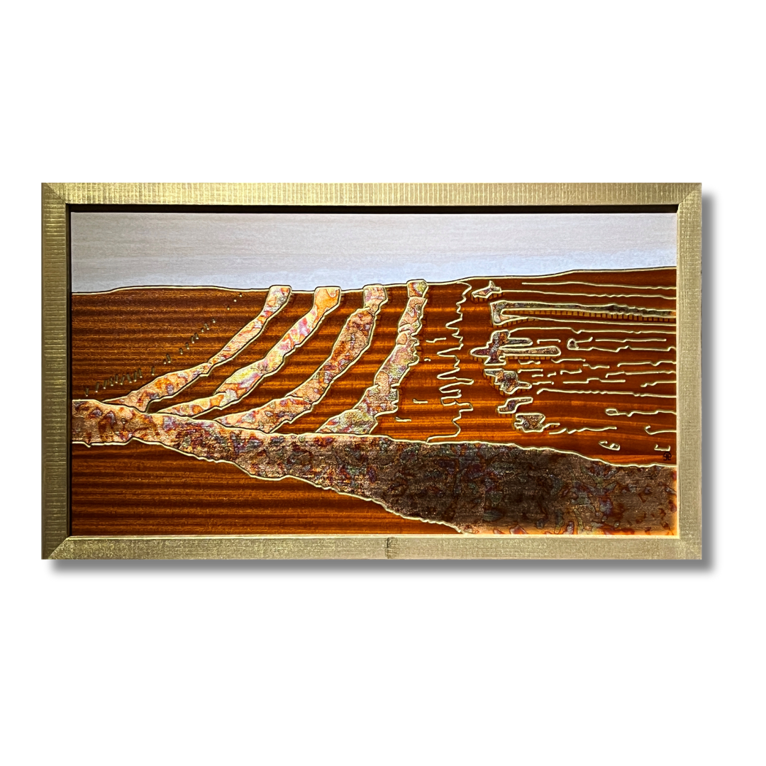 “Heaven and Nature Sing”, A Prairie Seen #177, stains, lacquer, sapele veneer & metal gilding, 14.25″ x 26.44″